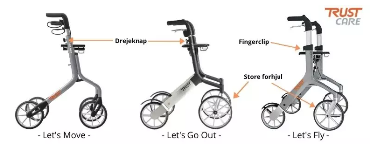 Svenske TrustCare fremstiller et par super lækre udendørs rollatorer, som går under navnene: Let’s Move, Let’s Go Out og Let’s Fly.